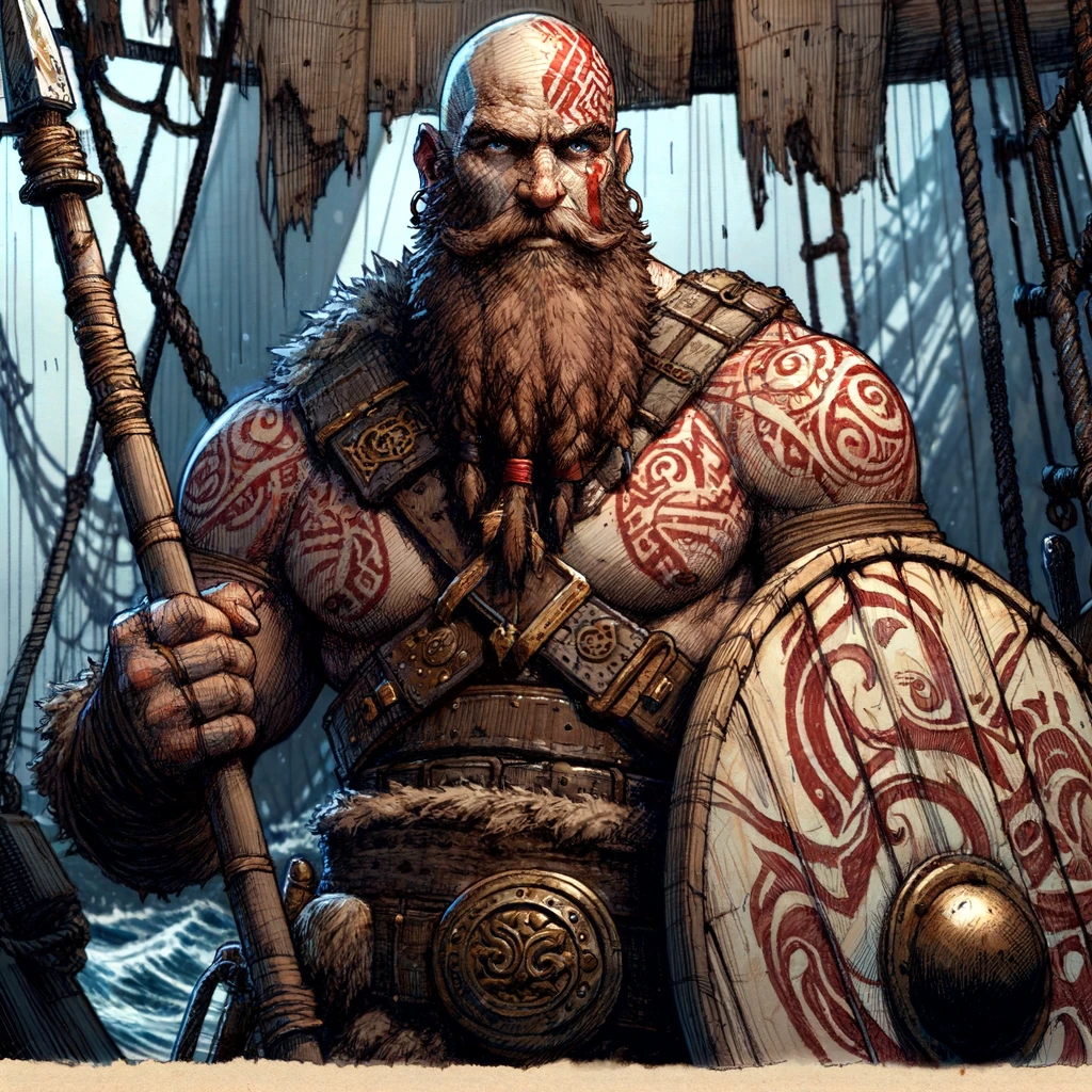 Ein kräftiger Skalde mit Glatze, rote Gesichtsbemahlung und brauner Vollbart.