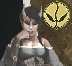 Warlock advisor to Dagult Neverember and high-ranking member of the Zhentarim. She became the Zhentarim envoy to the Council of Waterdeep. She seeks results at any cost, no matter the cruelty or collateral suffering.
