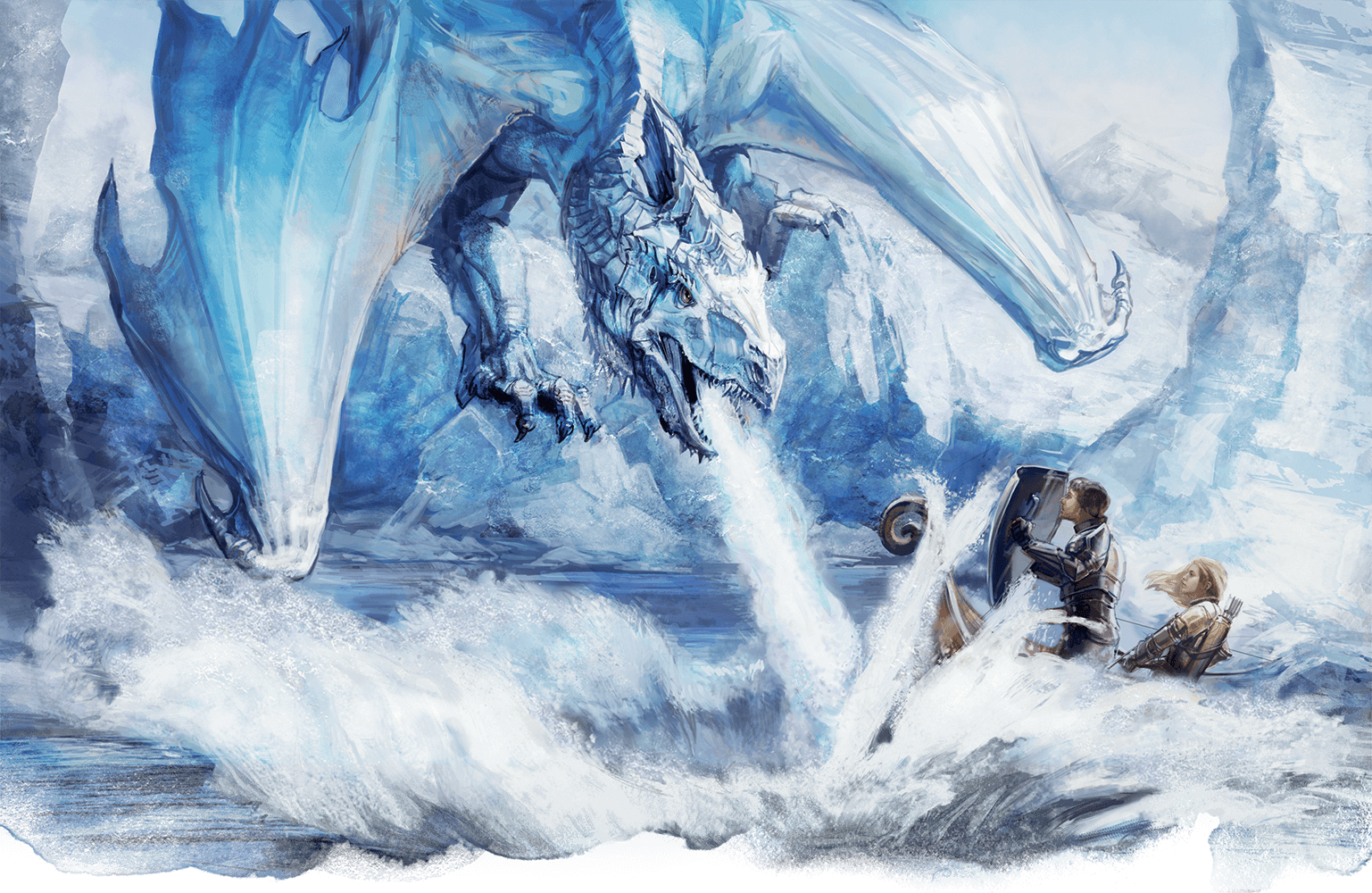 Following the "orders" from the strange Lords Alliance griffon-cavalryman Mon-Kei, the ship (needs a name!) sets off across the snows then the Sea of Moving Ice, to arrive on an iceberg inhabited by fishermen. The group has little trouble finding Maccath and convinces her its time to end her service to Arauthator and the group confronts the Unknown in its lair. This dragon is a pledged ally of the Cult and it is the intent of the group to end its life here. After great attacks launched as fiery spells, the Alagondar glaive, and counterspells to this adept spellcasting dragon, it is brought low - but before being able to make the killing blow, the dragon freezes Sudon and Dex into a pool, teleporting to order "STOP!", with its claws poised above the heads of the wounded-and-immobilized warlock and necromancer.