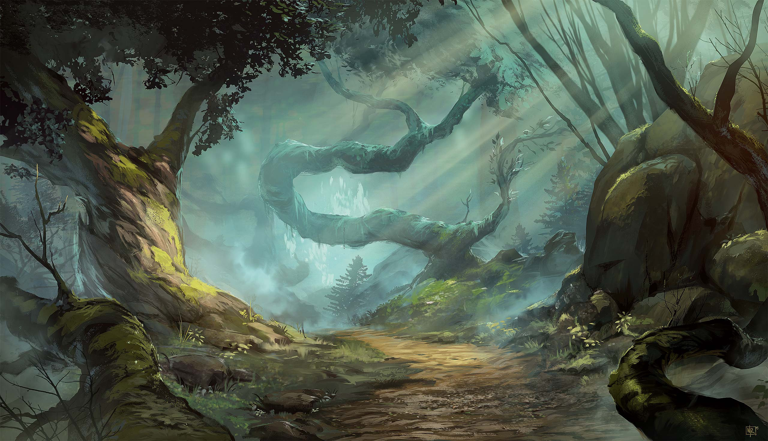 While a much smaller forest than Neverwinter Wood, the Kryptgarden Forest is far more sheltered and insulated from travelers, settlers and general attention. Paths are rare and overgrown, the vegetation is hostile, thorny, poisonous - in part by its nature in part from long being the domain and lair of the ancient dragon Claugiyliamatar, called "Old Gnawbones".  Plagued by vines, sawgrass, stinking fetid pools, swarms of biting insects, spiders with undue courage and stealth, and clouds of gas that disorient causing nausea and vertigo, travel is at best unpleasant.  Yet the importance of the journey causes the group to press on. More than a few times - even Willow comments that Tallon the Tall's plant-destroying axe Hew would have been a welcome assistant.