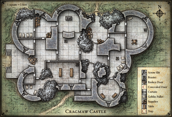 Cragmaw Castle is a ruin that has been taken over by the Neverwinter Wood. It once had seven towers, but now nothing really stands above the floors of the second story. A group of goblins and hobgoblins from the Cragmaw tribe have made this their base, led by a bugbear who calls himself King Grol.
