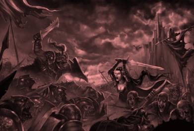 Then the most majestic horse I have ever seen turned out from the South Gate, ridden by Belcoria the Starfire Paladin who now held in her arms a great scythe as we use to reap at harvestime. This dread weapon glimmered with a purplish flame that suddenly flowed like a river of death through the ranks of the piling spiders. The noble steed breaking through their numbers and the brilliant weapon slashing and scorching to cinders scores of the creatures, instantly collapsing the growing ramp of clicking, hissing bodies at the wall.