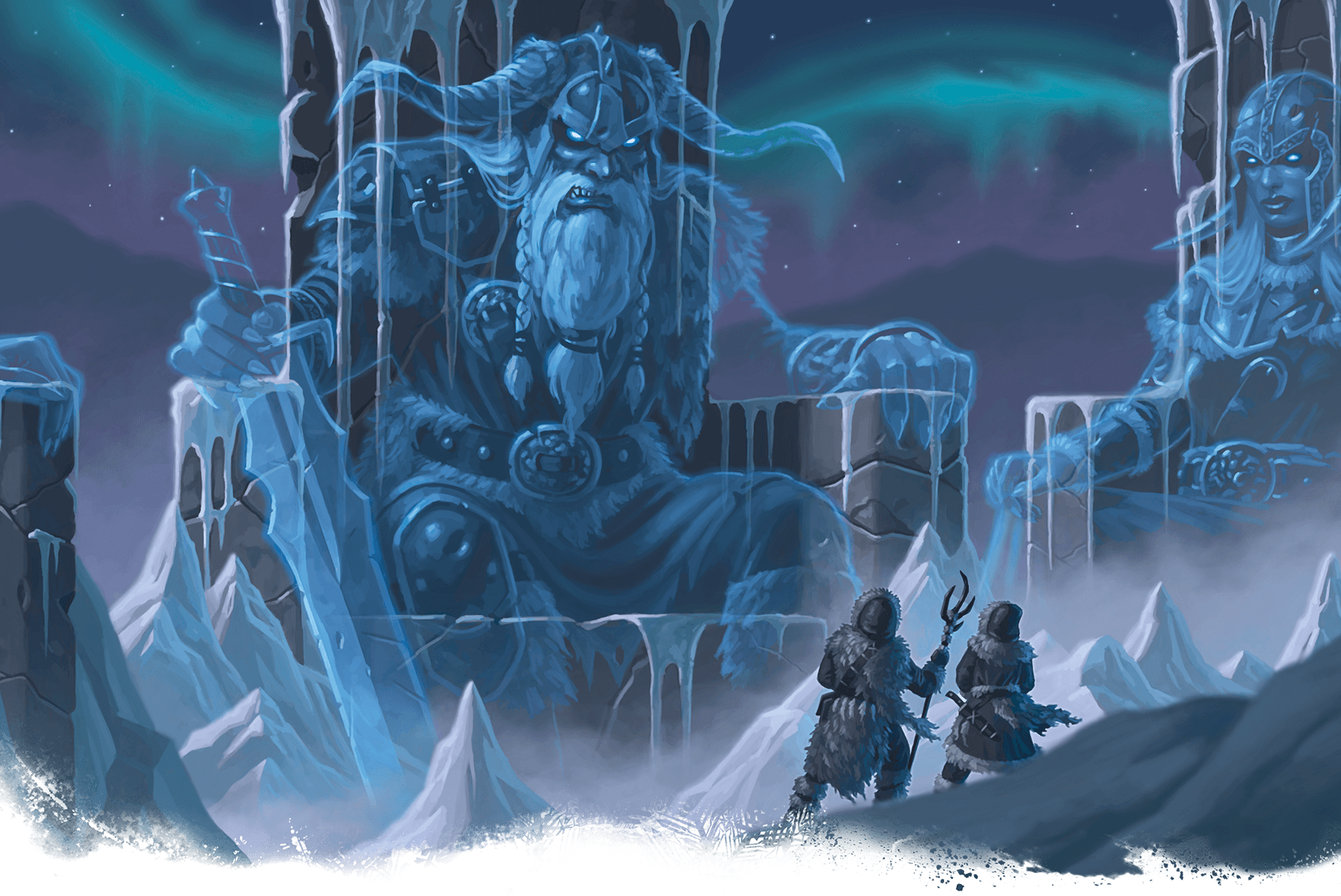 Arriving with the full moon of the 1st of Tarsakh, the ghostly figures loom above the party, conversing with each other while sitting in the enormous thrones, ignoring the tiny people until Zaknalimar uses Tongues to address the largest giant. This one, calling himself the Jarl of Jarls, Reggaryarva - challenges the party to prove they are worthy in a trial of combat and summons three deadly minions: a Frost Salamander, an Ice Elemental Warrior, and a Frost Giant Skeleton. The battle brings the group terrifyingly close to their own end, but victorious only having Alyks Askaria fallen, targeted for her powerful fire magics, but spared from death by the necromancy of Dex, who also - crucially to survival - had tremendously weakened the giant skeleton with Ray of Enfeeblement.