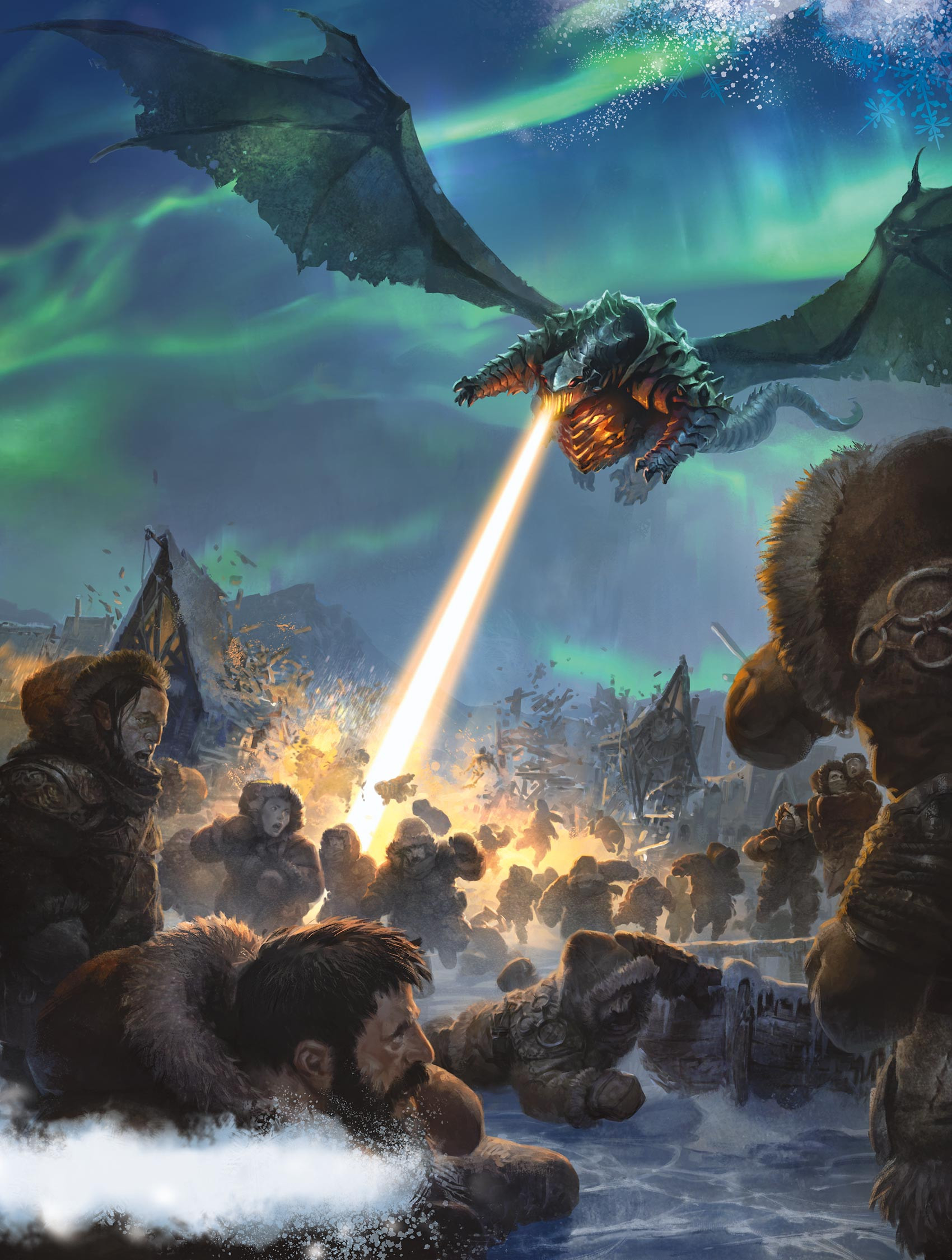 Epic confrontations befell the dragon in the towns of Bremen (whose defense was coordinated by Vaelish Gant the Brown - later made a hero from his valiant success) and Targos (defense and preparation aided by the Muzgardts and Zhentarim). Weakened in these battles, the mechanical beast followed its master's design to finally target the largest of the Ten Towns, Bryn Shander. its buildings cluttered and streets now swarming with refugees from all corners of Icewind Dale.