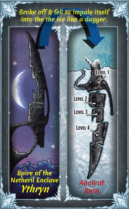 The last of the visions seen within that room brought into focus the urgency that we should quickly finish our tasks in that ruin while we still had time. Visiting and event of the near future - but how near unknown and too dangerous to chance, we watched as a great tremor of power washed over the entire continent of Faerûn. We saw but a flash of its cause, the use of a great artifact called the Draakhorn, sounding a signal bringing millions of creatures to halt a moment as it passed like a prickly wave of warning out and out and out across the lands and water. In some places the earth itself slipping and quaking, cutting off passages, collapsing towers and caverns, or opening others. In the Frozenfar, beneath Kelvin's Cairn, forges of the shield dwarves collapse while southward in the underdark beneath Caer Konig, another opens, lined with runes of deep red and a sense of a dread gateway. Something too awful for the mind to recognize twitches beneath the colossal Reghed Glacier to the east. Vellynne's sealed-off tomb-within-ice opens a route for escape, into the Underdark. In the skull-palace of Auril, great icicles and tumble and walls crack. But most concerningly for us, a crack long still preventing this very shard from diving deep beneath the ice into an unknown abyss shifts just enough to swallow the Netheril's lost spire. And so, we fled the room to hasten Dzaan to conclude our business in the magical chamber, that we might flee before that disaster!