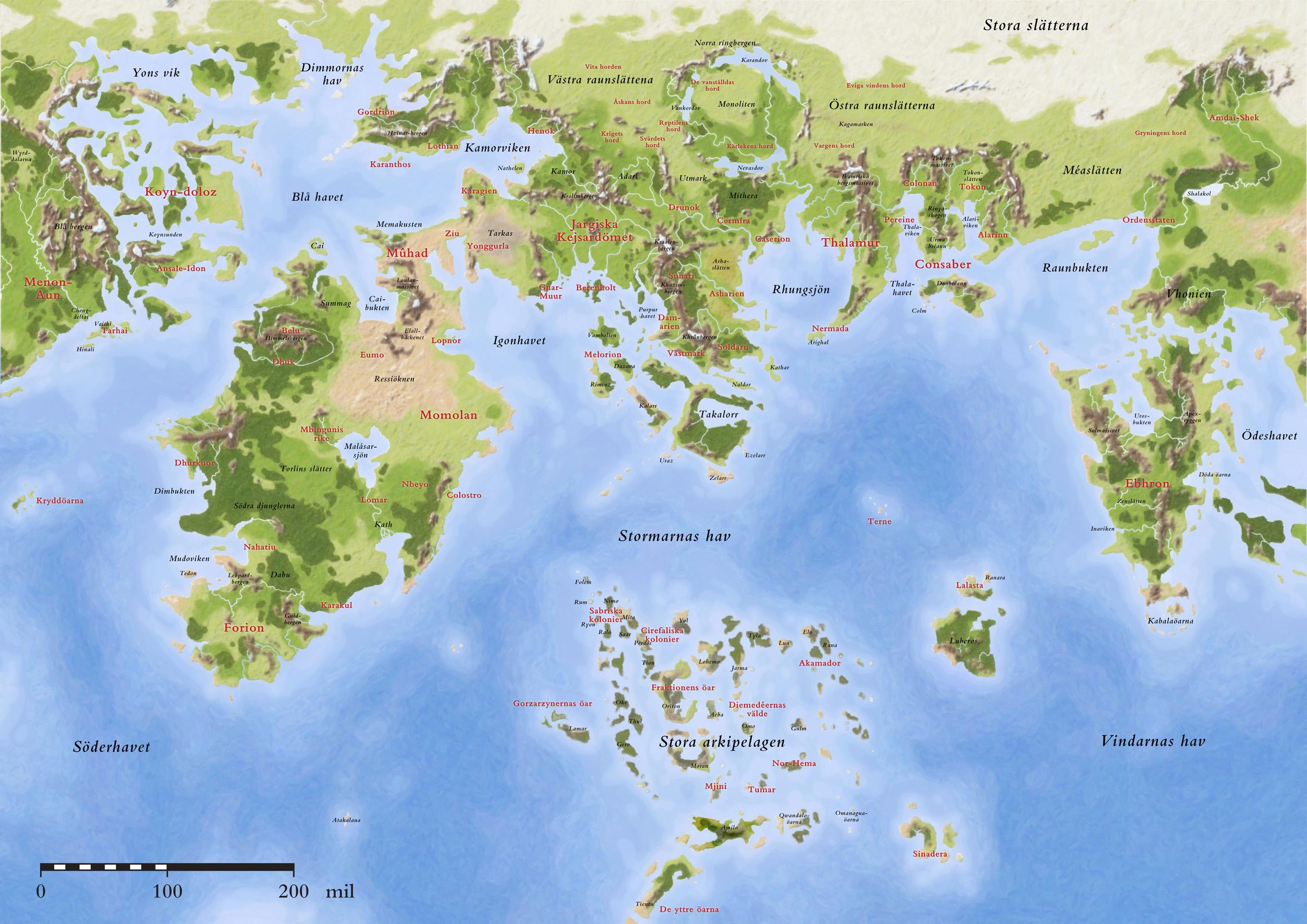 Människofolkens land på Khoran / i världen sträcker sig mellan Blå havet och Söderhavet i väst, till Ebhron och Vindarnas hav i öst.