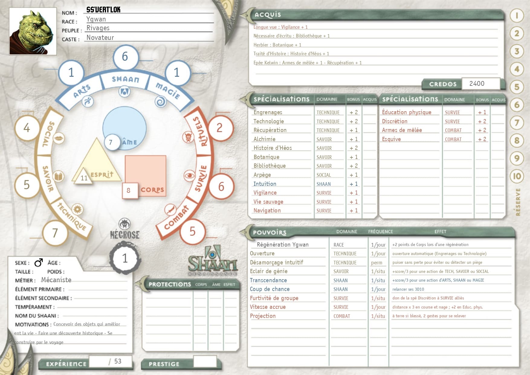 En dehors de sa formation, il s'intéresse avec ferveur aux Sarens, lointains ancêtres de son espèce. Il étudie dans son temps libre leur histoire et les théories que les chercheurs tirent de leurs observations. Il espère pouvoir redonner à son espèce l'éclat qu'elle avait lors de l'âge d'or des Sarens.