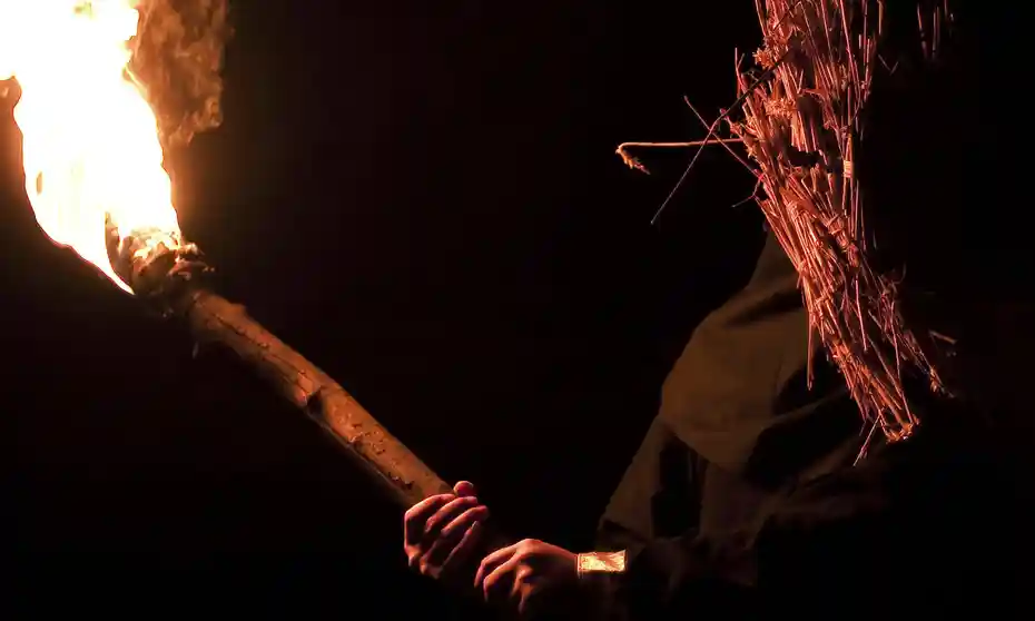 He reaches to open the door, but it won't budge. As the malevolent yells and hoots echo throughout, the man whimpers and collapses, sliding down the corridor wall with his back.