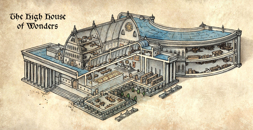 The wall is pierced in three places, the Main Gate, on Seawatch Street, is the ceremonial entrance to the main cathedral of the temple, and the most used by the general public and vistors. The South Postern Door opens onto Gondswatch Lane, and is the most heavily used by the acolytes and crafts-folk that frequent the inner courtyard, and the Trades Gate is the large, double wooden-beamed entrance for the heavily laden wagons of wood, stone, and metal ingots used in the temple's active creative ventures.