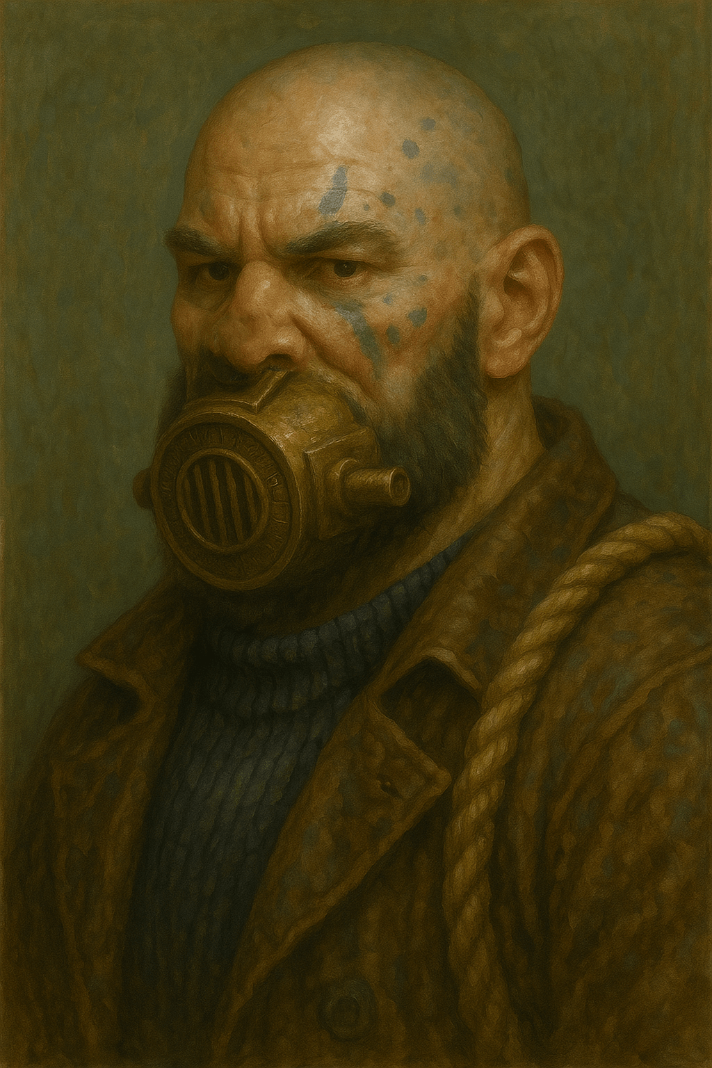 Gruff and soot-streaked, Baldrek Smokejaw is a giant of a man, his skin marked by stone-gray ridges and burns. Years ago, a geyser blast tore away much of his lower jaw, leaving him to speak through a rune-etched brass voice box that rattles like distant thunder. Despite his scarred visage, his eyes hold a sharp light — he misses nothing in his harbor.