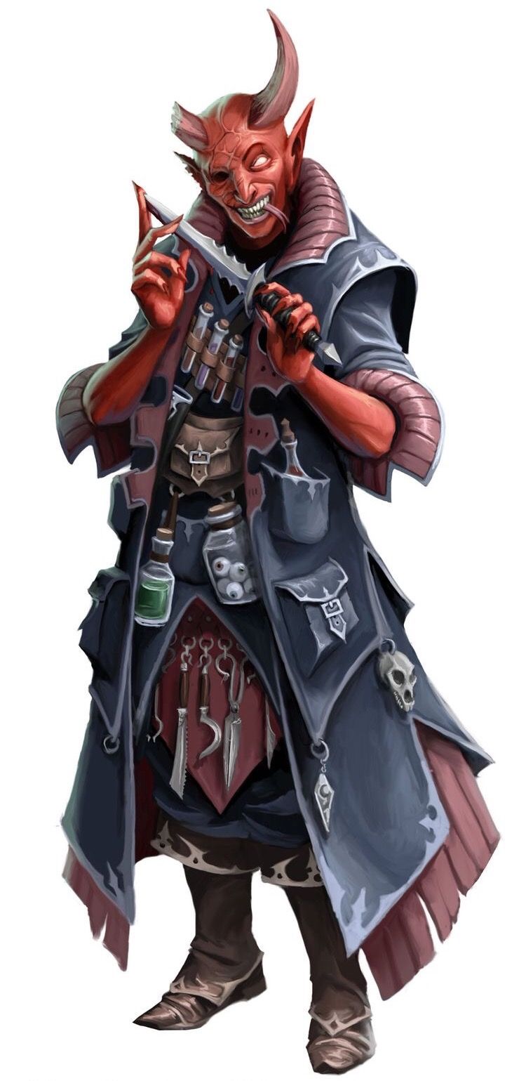 Male Ethactic Tiefling. Veiny, bald skull, wicked grin, and heavy smoker. Wants to learn people's ticks, relentless haggler, and values uniqueness. Doesn't take responsibility for the consequences of his creations. His shop is called Irregularities.