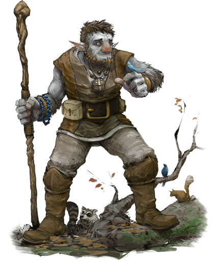 Firbolgs are fey-oriented half-giants. Their tribes cloister in remote forest strongholds, preferring to spend their days in quiet harmony with the woods. When provoked, firbolgs demonstrate formidable skills with weapons and druidic magic.
