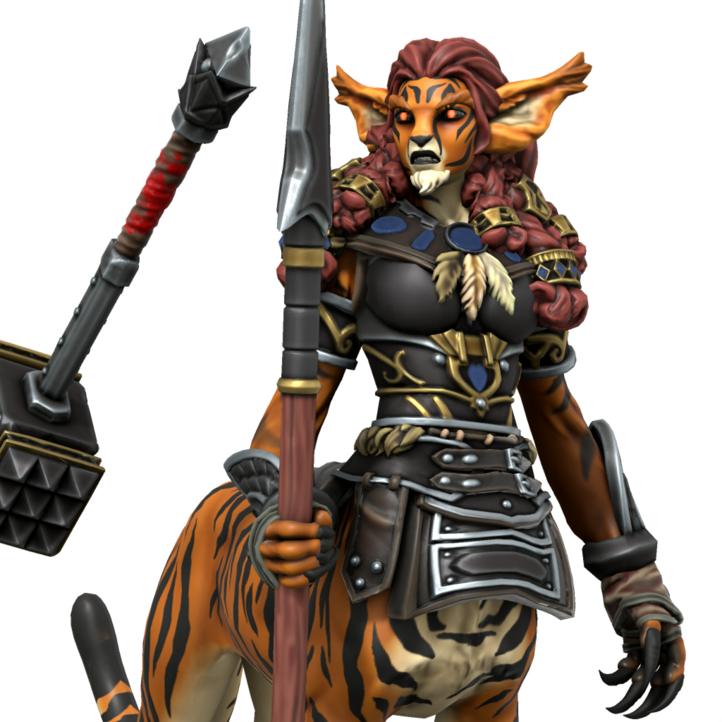 She has the upper body of a shifter woman, and her lower body is that of a tiger. She is truly a force to be reckoned with on the battlefield, wielding a spear and a large hammer with superhuman strength. For the most part, she has avoided engaging with the Carrion Tribes, outside of violence.