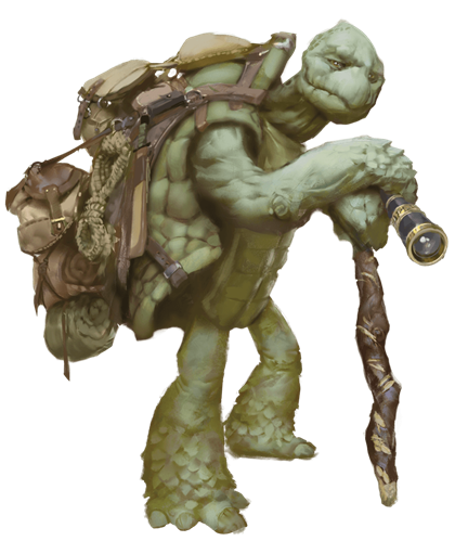 Tortles have a saying: “We wear our homes on our backs.” These turtle folk live on many worlds, most often journeying up and down coasts, along waterways, and across the sea. Tortles don’t have a unified story of how they were created, but they all have a sense of being mystically connected to the natural world. Carrying their shelter on their backs gives tortles a special feeling of security wherever they go, for even if they visit a far, unknown country, they have a place to lay their heads.