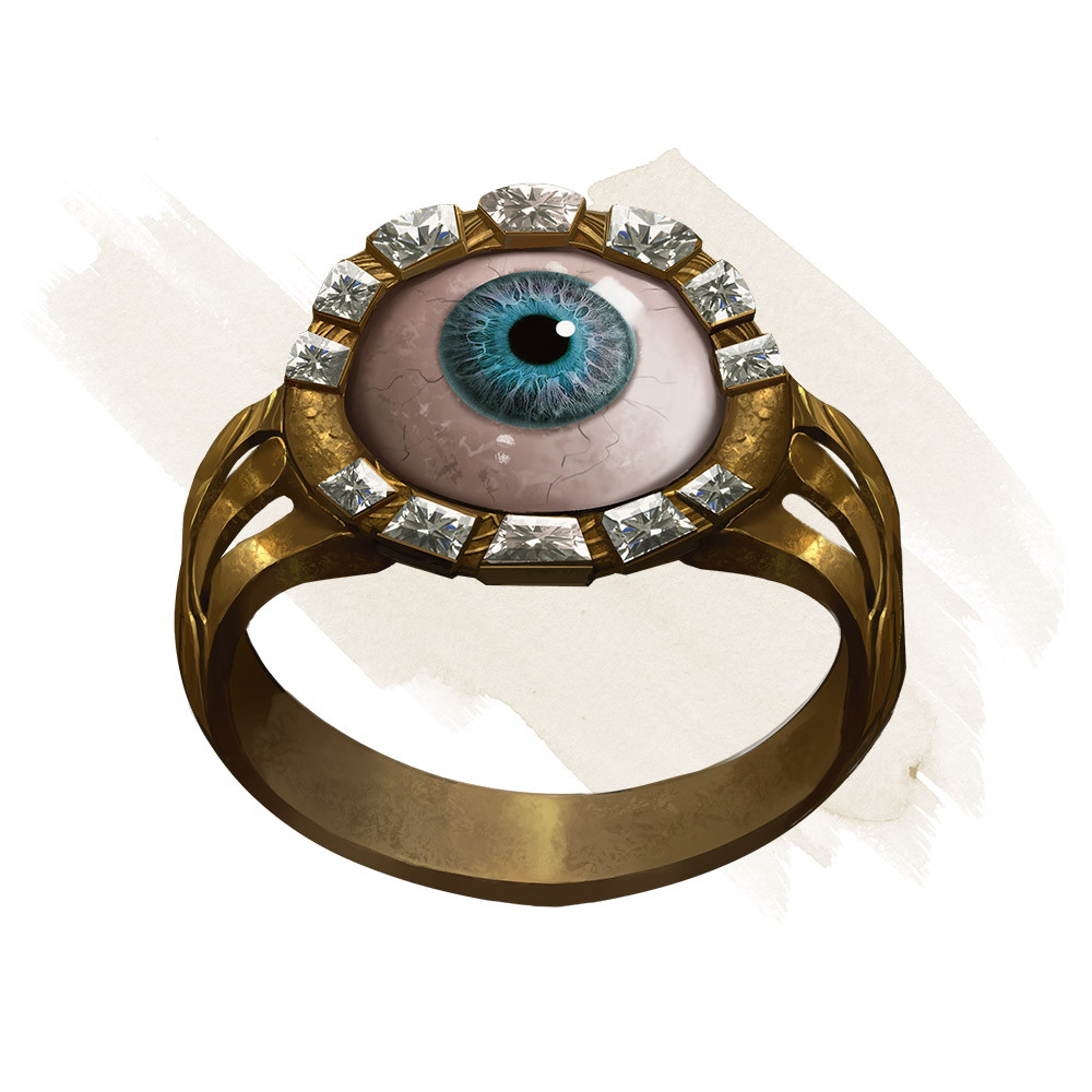 While wearing this ring, you can use an action to speak its command word. When you do so, you can see into and through solid matter for 1 minute. This vision has a radius of 30 feet. To you, solid objects within that radius appear transparent and don't prevent light from passing through them. The vision can penetrate 1 foot of stone, 1 inch of common metal, or up to 3 feet of wood or dirt. Thicker substances block the vision, as does a thin sheet of lead.