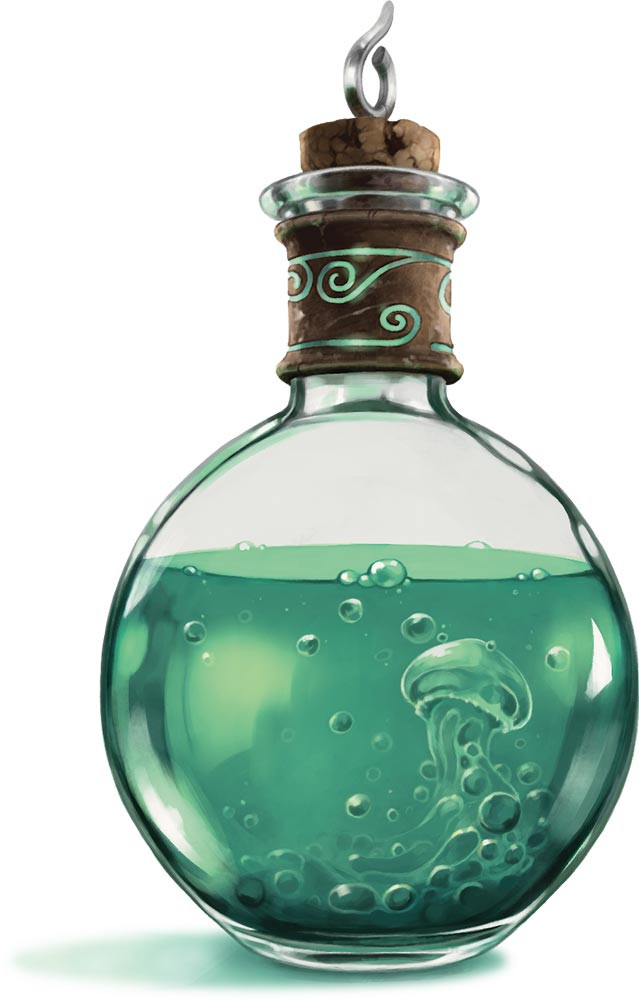 You can breathe underwater for 1 hour after drinking this potion. Its cloudy green fluid smells of the sea and has a jellyfish-like bubble floating in it.