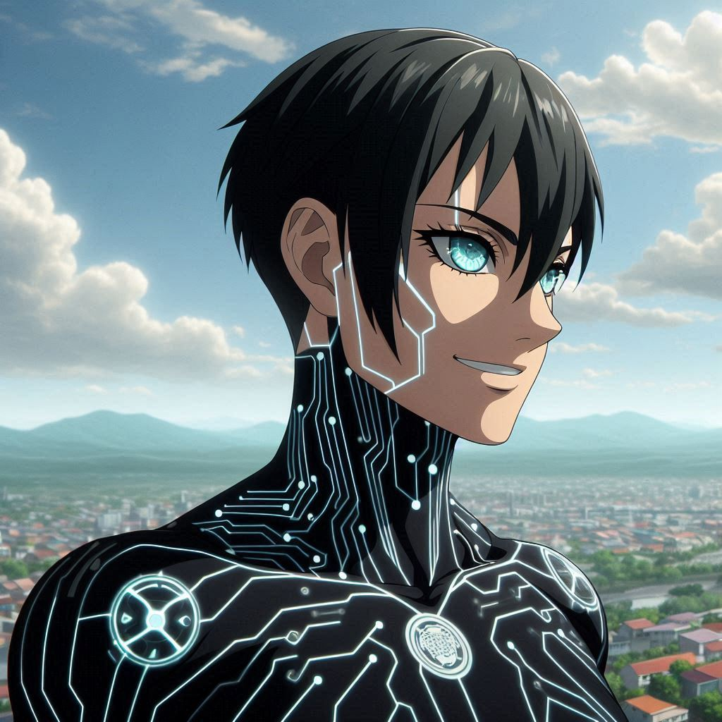Eren has short black hair, their wearing a bodysuit made out of some sort of dark nanotech fiber. Along the suit are blue glowing circuit patterns that seem to stretch up into their exposed neck. The same blue glow is in their eyes which carefully scan around the room. They’re slim, but muscular and stand about 6 feet tall.