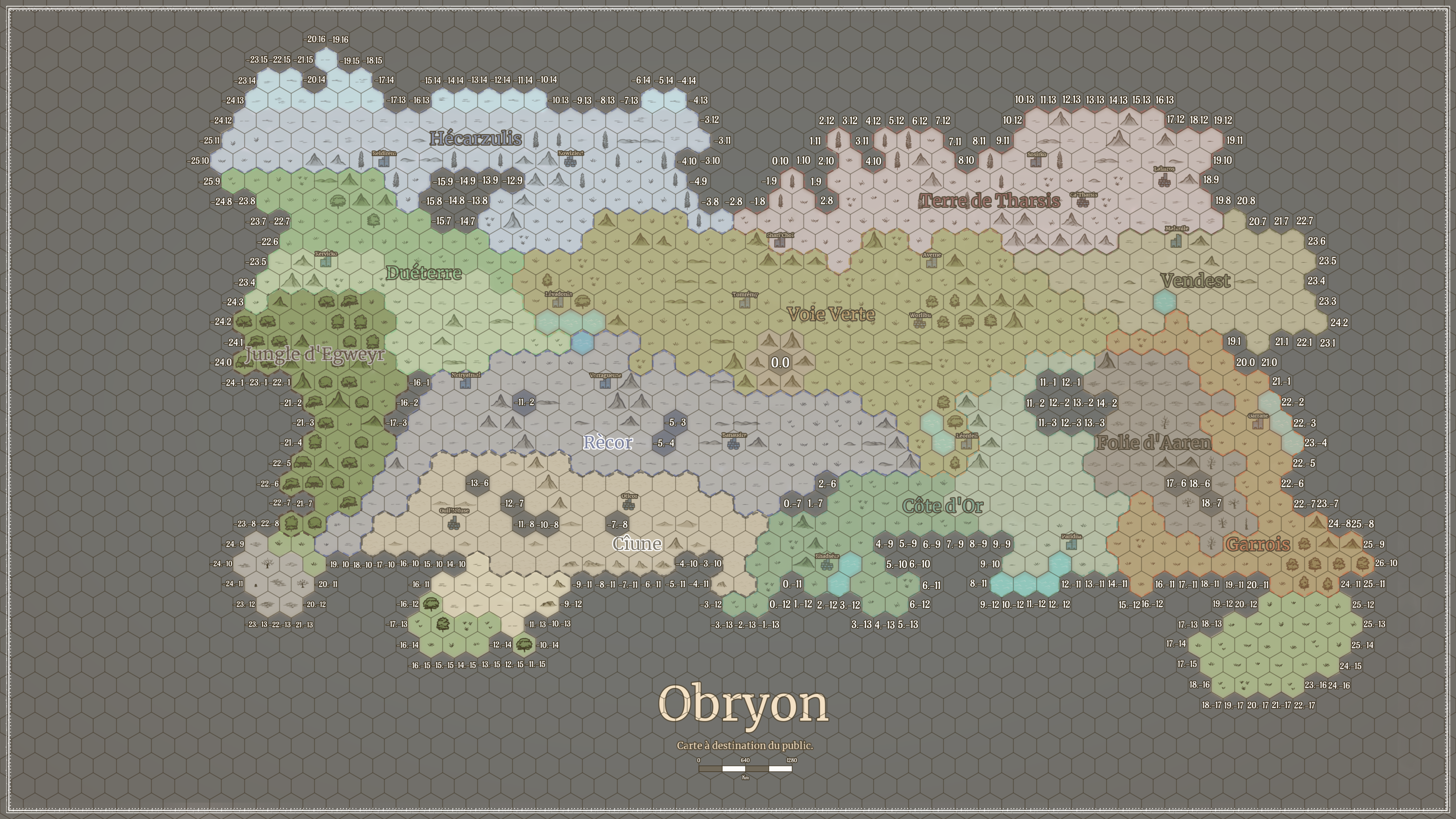Ça devient un brin dérangeant pour les ordonnées, mais ce n'est pas méchant. Le problème qui se pose avec des hexagones, c'est de définir si on augmente vers la gauche ou la droite. Dans notre cas, l'hexagone (0.1) est celui légèrement en haut à droite de (0.0). Le truc, c'est qu'il faut se réaligner par la suite, dans ce cas (0.2) est l'hexagone légèrement en haut à gauche de (0.1) et qui est directement aligné à (0.0). Même fonctionnement pour aller dans les négatifs.