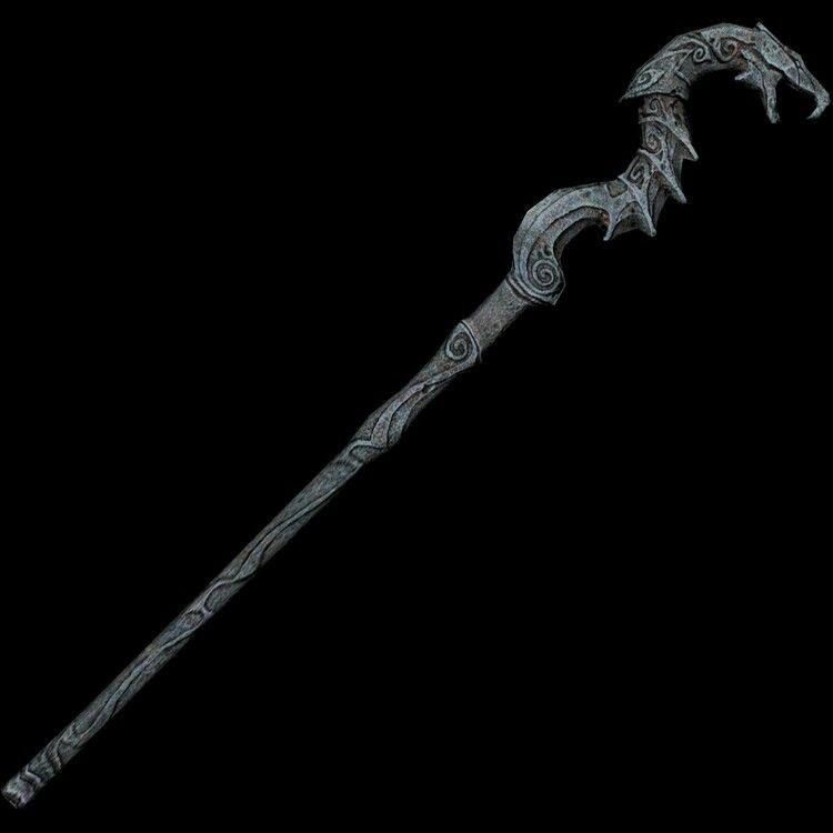 The holy symbol of the House of Seasons is engraved in the gray, weather bleached wood. Runes for the four seasons and their respective goddess aspects decorates it. The Graystaff is covered in a fine sheen of delicate ice that never melts. Typically the top of the staff is carved to represent a powerful spirit found in Rashemen. This one depicts a White Dragon Telthor head.