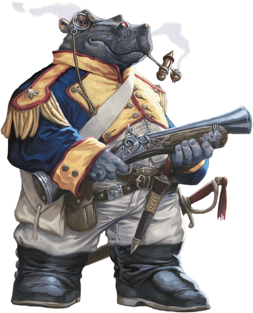 Giff are tall, broad-shouldered folk with hippo-like features. Some have smooth skin, while others have short bristles on their faces and the tops of their heads. As beings of impressive size and unforgettable appearance, giff are noticed wherever they go.