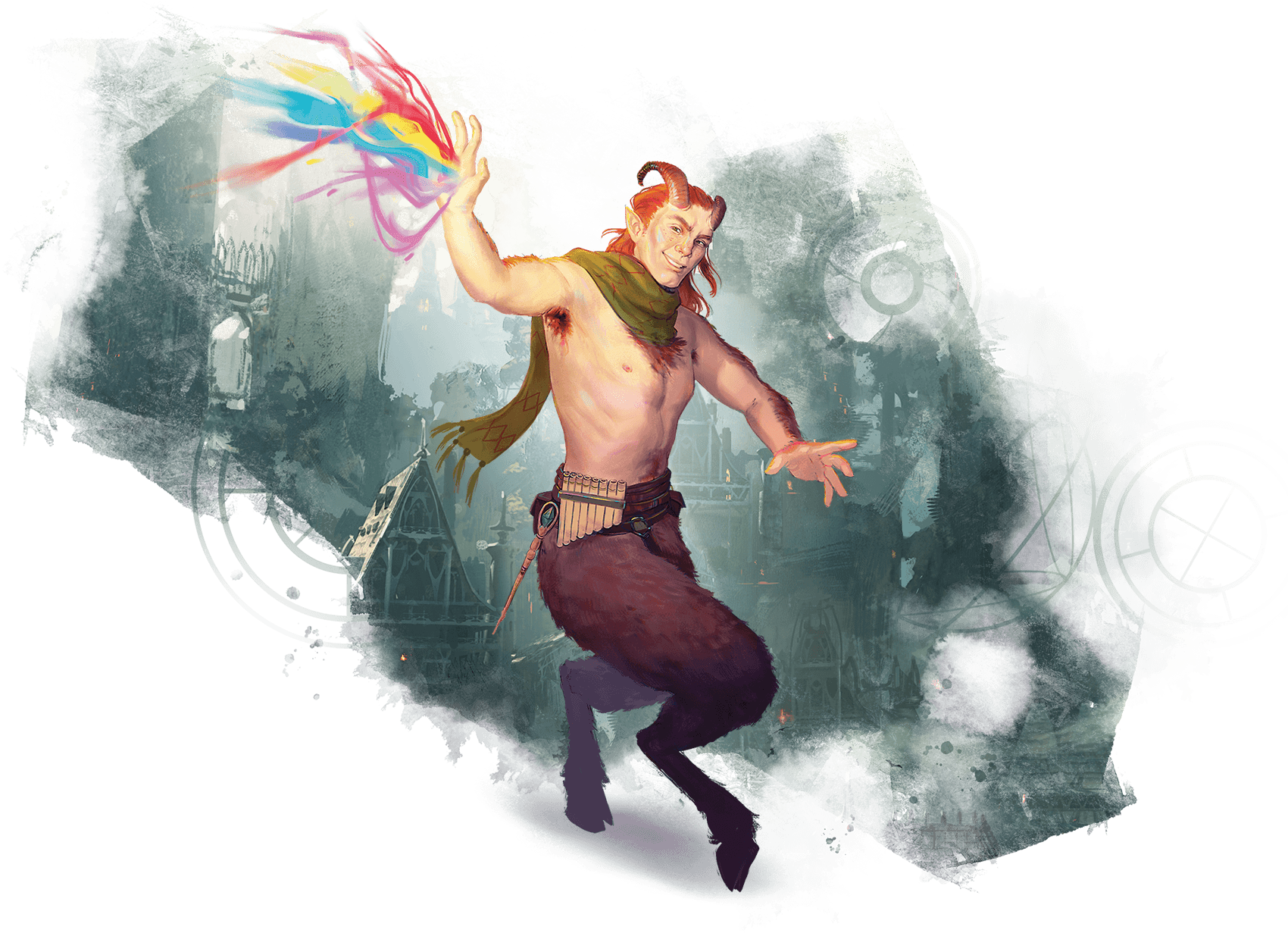 In their physical forms, satyrs embody a fusion of humanoid civilization with the freedom of wild beasts. Generally, they look similar to humans, with a range of builds and features. But their goatlike horns, pointed ears, and furred lower bodies sharply distinguish them. Satyrs' solid horns connect to their heads at the base of their skulls, while their legs end in sturdy hooves. Thick fur covers their bodies from the waist down, shorter at the waist and longer below the knees. Short, soft hair grows down their neck and spine, along their shoulders, and on their forearms.