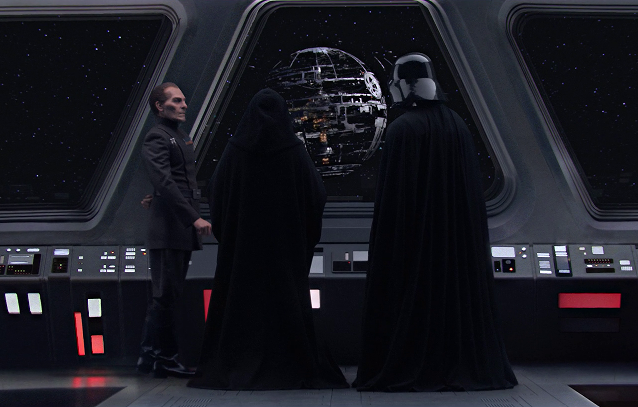 Tarkin mostra a Estrela da Morte, em construção, ao Imperador Palpatine e Darth Vader.