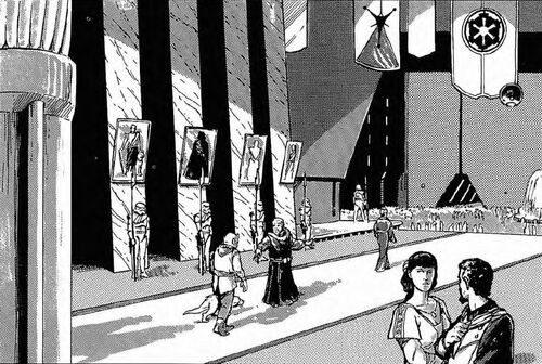 Uma força simbólica de stormtroopers protege o consul imperial Dandamont Pring.