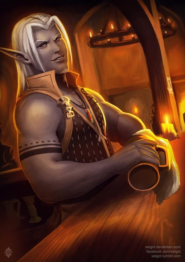 A drow having left the underdark and began living in the town. He had met the love of his life and made a tavern together so they could run it.