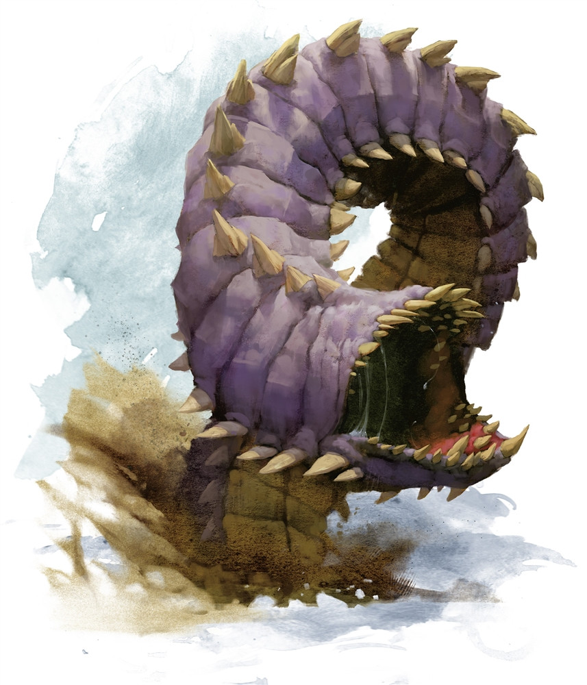 Though most common in the Underdark, purple worms are frequently seen on the surface world in rocky and mountainous lands. The maw of a purple worm is large enough to swallow a horse whole, and no creature is safe from its hunger. It lunges forward by rhythmically compressing and expanding its body, catching other Underdark dwellers by surprise with the speed of its advance.