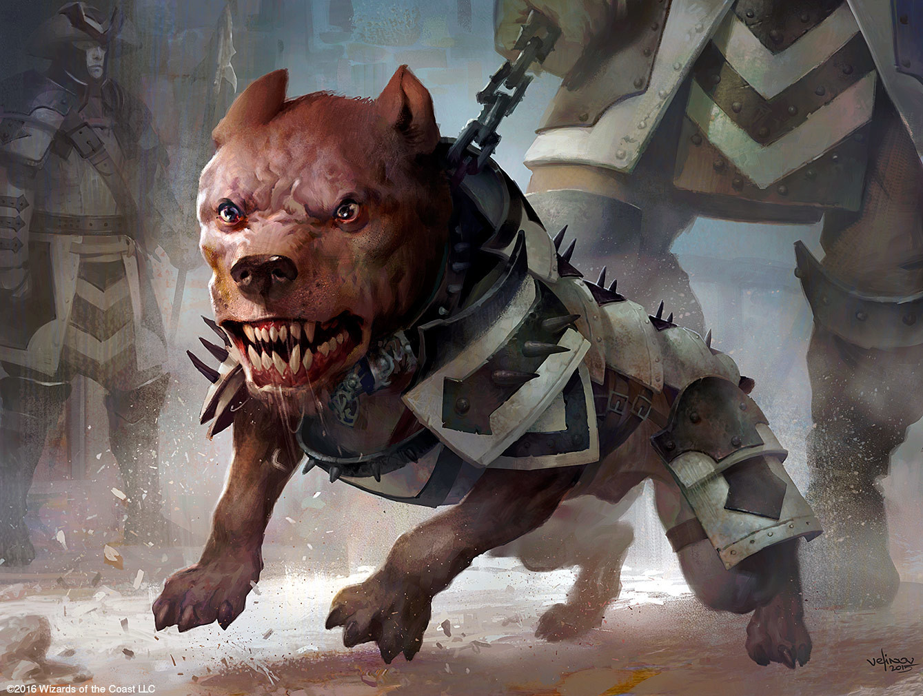 These hounds are as stout and strong-willed as their dwarven masters. Despite their heavyset build, dwarven mine dogs are quite flexible and adept at squeezing through small crevices. These traits help them to fulfill their most common duty of clearing mine shafts of verminous pests hiding within small nooks and crannies.