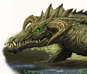 A swamp drake appears as wingless dragon with alligator-like features. It has a wide, U-shaped snout, tail, and scute-covered hide of an alligator and the head, horns, and limbs of a black dragon. Swamp drakes usually live in the same places as alligators and crocodiles do.