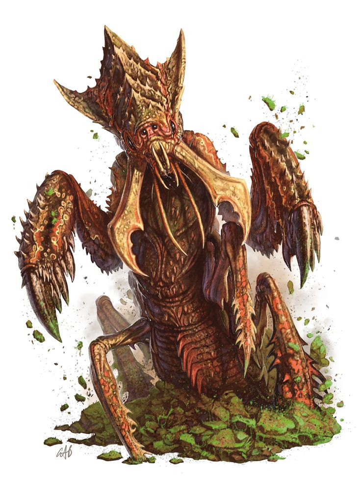 An ankheg resembles an enormous many-legged insect, its long antennae twitching in response to any movement around it. Its legs end in sharp hooks adapted for burrowing and grasping its prey, and its powerful mandibles can snap a small tree in half.