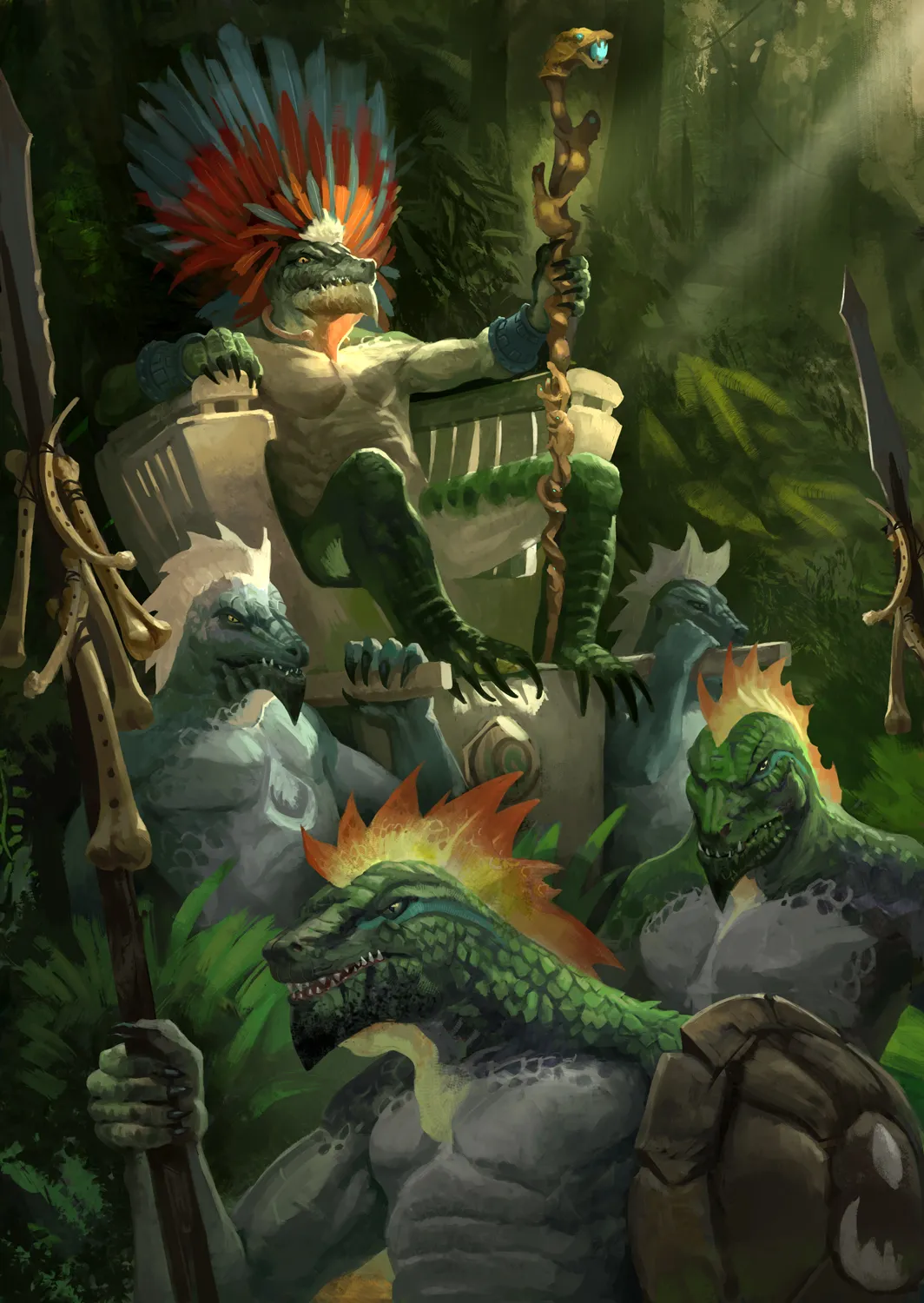 After donning their armor once more, the group made their way with the Lizardfolk to their camp, Effie getting carried by way of the Eleeven tree cage she had been put in. Contrary to expectations, they were left entirely unbothered by the Lizardfolk when they got there, most ignoring them entirely. After getting Effie out the cage, the group sought out the captives, who seemed to be well looked after, with all but one of them free of the cages and able to come and go as they pleased so long as they didn't try to leave. Reassured the guards were not being mistreated, the group went to negotiate for the guard's release with , the Lizardfolk chief, and Hissain who appeared to be his advisor.