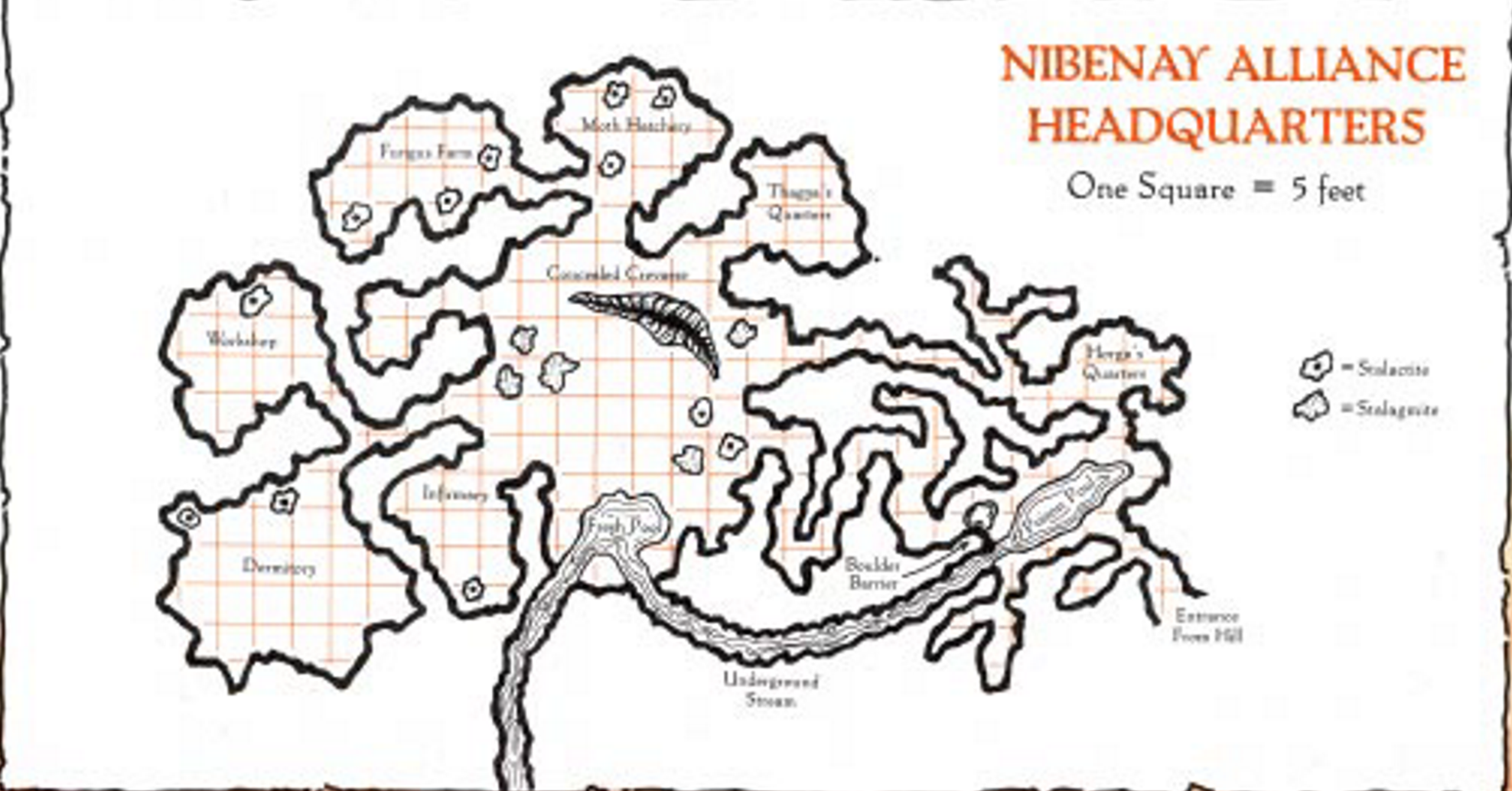 Here general Alliance meetings take place. Many alcoves and ledges serve as storage areas and sleeping platforms for guests. A clear pool provides a source of fresh water. Long stalactites hang from the ceiling, and trimmed and sanded stalagmites form crude but comfortable seats. A soft yellow light bathes the entire chamber, courtesy of the thousands of isha moths clinging to the ceiling. The subterranean isha moths co-exist peacefully with the Alliance. The moths share their natural fluorescence, and the members grow and harvest a special fungus to feed the moths and keep them healthy. A broad crevasse snakes across the floor of the east end of the main chamber. Instead of filling it in, Thagya ordered the crevasse covered with a lattice of branches and a layer of dirt spread across the top. Should intruders invade the chamber, the Alliance members try to maneuver them into the crevasse, where they drop 30 feet and land on sharp stones. A network of passages links the main chamber with several smaller caverns, each with a designated purpose: