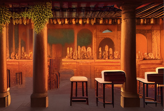 Mordan, a caravan master turned brewmaster, the Corner Bar is a two story structure