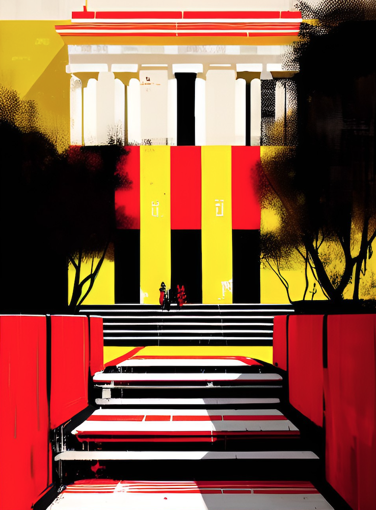 structure is painted in vertical yellow and red