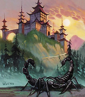 La ubicación física de Kyuden Bayushi en lo alto de su meseta parece estar basada en la ventaja militar, pero algunos forasteros han observado que hay otros lugares en la provincia que podrían haber sido mejores opciones. provincia que podrían haber sido mejores opciones. La verdadera razón de esta ubicación es conocida por muy pocos, incluso dentro del Clan Escorpión. Debajo de la meseta hay una red de túneles, un laberinto de pasadizos y cámaras secretas donde se guardan muchos de los tesoros más sagrados (y peligrosos) del clan. Y en lo más profundo de esos túneles se encuentra el Lago Dormido, una masa de agua sagrada que, de algún modo, está conectada con el más allá. Durante mil años, el alma del Kami Bayushi apareció allí, buscando a su seguidor perdido y verdadero amor Shosuro. Aunque esta búsqueda se resolvió finalmente durante la Guerra contra la Oscuridad, se sabe que el alma de Bayushi sigue apareciendo en el lago, observando a sus descendientes desde lejos, juzgando sus acciones y, de vez en cuando -muy de vez en cuando-, ofreciéndoles orientación.