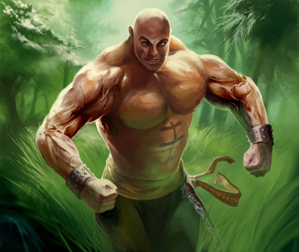 Mientras miráis, Osuno sostiene una mano extendida con la palma hacia el suelo, y un ono enorme formado de hierro y jade se eleva desde el suelo de la cueva hasta su mano. Levantando el arma en alto, Osuno da un paso lento y deliberado hacia los bakemono congelados por el terror. Sus ojos brillan con una luz verde pura, y las burlas retorcidas de los bakemono se queman como niebla a la luz del sol ante su furia de jade.