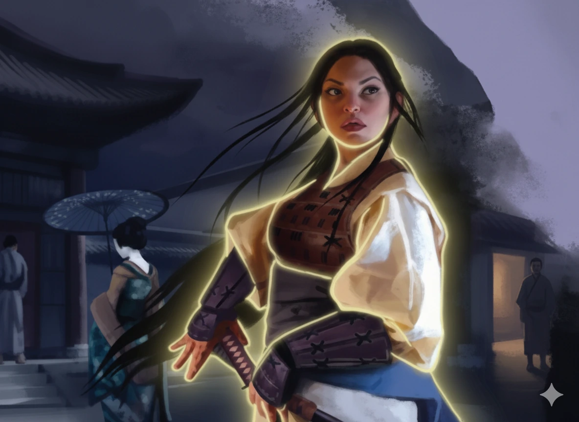 Enuko es una Espíritu Retornado de los pacíficos días de Hantei XXII. Está totalmente entregada a la idea de devolver al trono a un miembro de la dinastía Hantei, y su servicio aquí como guardia probablemente pretende transmitir un mensaje sobre el apoyo del Clan del Dragón al Campeón Esmeralda. Enuko es fría y distante, incluso para un espíritu que pasó un tiempo en Meido, el Reino de los Muertos, y es poco probable que pase mucho tiempo en compañía de samuráis del Clan.