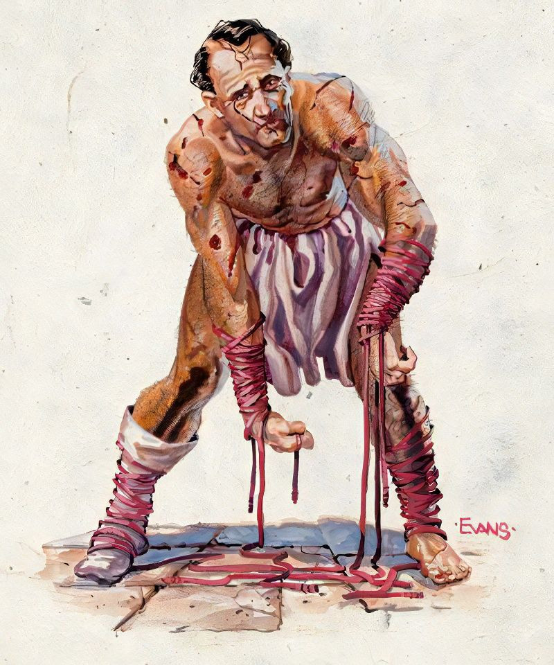In avatar form, Ilmater appeared as a short man with a burly build and wearing only a breechcloth, with a plain but kind and comforting face, balding head, and a hairy body. But this body bore the marks of mutilation and torture on the rack, covered with open cuts, closed scars, burns, and a range of other wounds. Ilmater's joints were broken, his limbs were ravaged, and his hands were smashed yet still functional. Moving caused him a great deal of pain as he dragged himself around. No matter how much his avatar healed, it still showed these terrible wounds.
