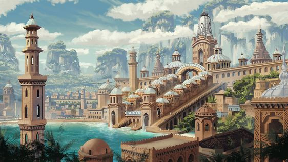 Surnommée "la cité des deux dragons", Ghalan est une ville portuaire du Trevenias et la capitale du duché de Bayat. Word count: 20