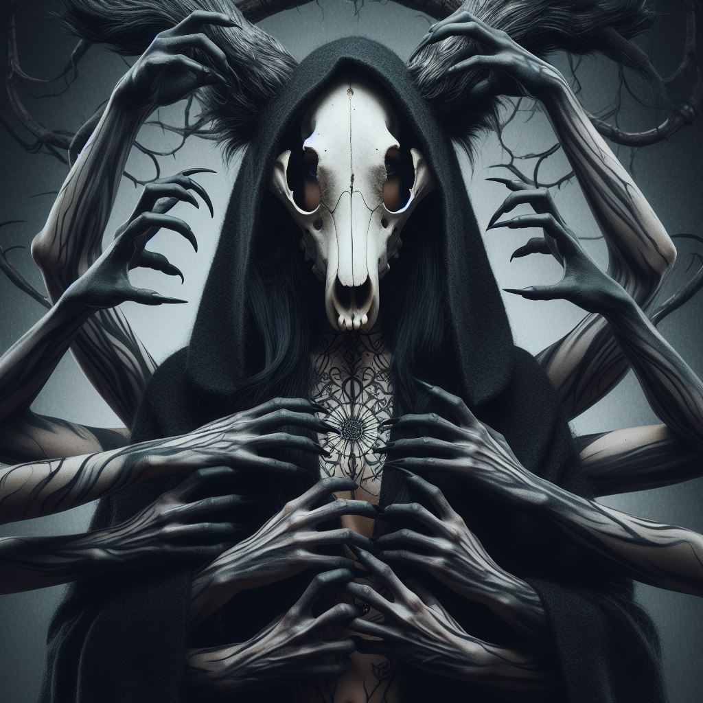 She takes the form of a skeletal wolf enveloped in shadow essence, but the shadow does not envelope the skull. Her humanoid form is that of a woman with a wolf skull for a mask, has long black hair, and wears a cloak made from a black wolf’s hide.