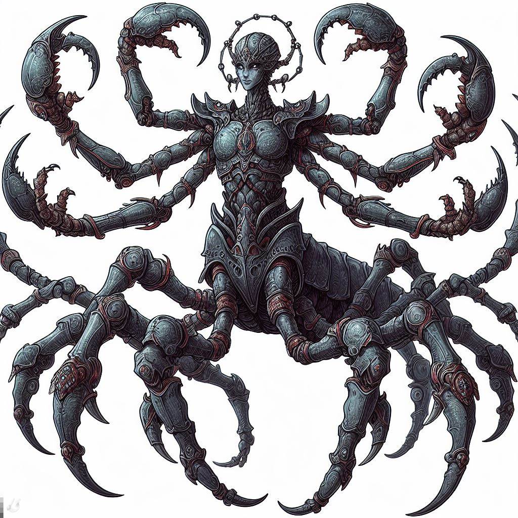 Kot-Thou manifests as a monstrous amalgamation of man, scorpion, and spider, embodying the very essence of poison and disease. His form is both terrifying and awe-inspiring—a humanoid torso with chitinous exoskeleton, multiple arachnid limbs extending from his sides, and a scorpion's tail arcing over his back, tipped with a deadly stinger dripping with venom. His eyes are multifaceted like those of an insect, glowing with a sickly green light that pierces through the shadows. His skin is a mottled gray-green, resembling the color of decaying flesh or stagnant swamp water.