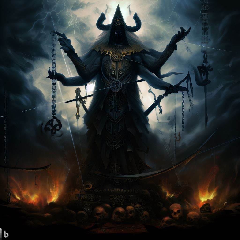 He takes the form of a 30-foot humanoid with 4 arms. It wears a helmet in the shape of a pyramid with curved, thick horns that sprout from the side. He's adorned in intricate gold-plated armor laid with raged cloaks. Chains attached to cuffs hang from its wrists, and many blades pierce through his flesh.