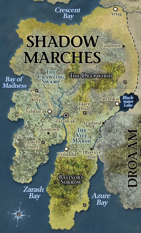 The Shadow Marches lie in the lowlands west of the Byeshk Mountains and south of Crescent Bay. The hills bordering the swamps and marshes of the Shadow Marches start at the southwestern tip of Crescent Bay and wrap east and south to Blackwater Lake where Patrahk'n lies at the edge of The Vile Marsh. The Watching Wood forms the rest of the eastern barrier for the Marches. To the south of the Marches, Balinor's sorrow stands a solitary monitor to the swamp's progression past Urthhold, while Zarash Bay acts as water source and custodian of the marshlands south of Lantern Tower as well as the primary sea access to Zarash'ak. To the west lies the ocean.