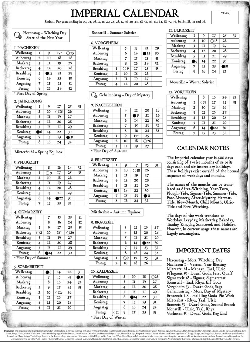 | Workday | Levyday | Marketday | Bakeday | Taxday | Kingday | Startweek | Holiday |
