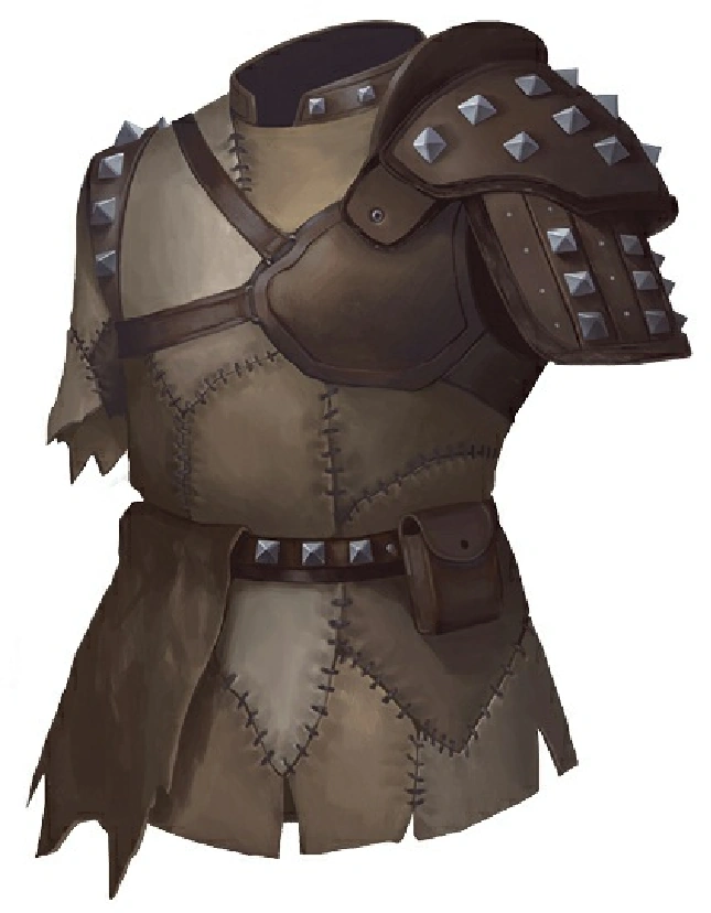This leather armor is reinforced with metal studs and sometimes small metal plates, providing most of the flexibility of leather armor with more robust protection.