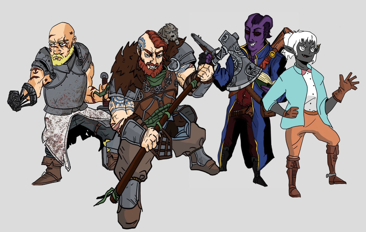 Está Lander Acatador Del Llamado, un guerrero que proviene de las tundras congeladas de Askarov y lucha por la gloria de su tribu y el honor de sus ancestros. Thymos Blackgate, un joven tiefling que blande el arma de una era olvidada y busca desenterrar las verdades ocultadas por los siglos. Kovacs y Nyx, un hombre en búsqueda de venganza contra un ser llegado mas allá del velo del tiempo que le robó a la única persona que le enseño que era la redención y un lobo que sigue a su actual amo. Unknown una drow que creció alejada de su cultura, adoptada por aquellos que luchan contra las abominaciones que viven en las entrañas de la tierra. Por ultimo esta Lieff, un perro que adquirió la capacidad de hablar por medios desconocidos y amante de las salchichas.