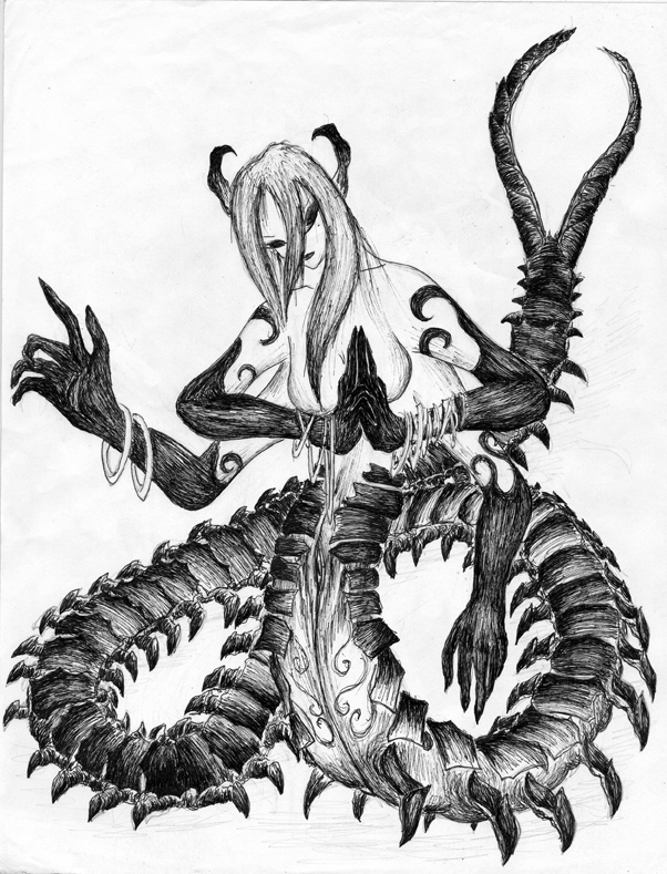 At first, appearing to be a woman of middle age, as pale and as white as bone, with hair as black as pitch. But beyond that appearance her legs don’t exist, stretching out into the body of a massive centipede ending with a vicious stinger. Hidden within her mouth are sharp fangs, wicked pincers, and dripping acid.