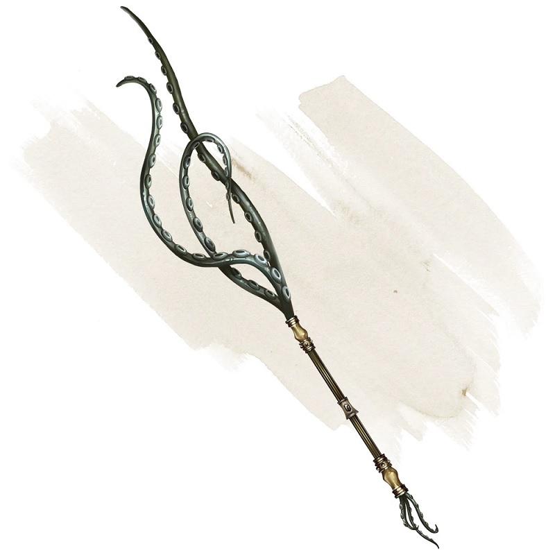 This rod has a head of warm, rubbery tentacles, and it functions as a magic mace that grants a +1 bonus to attack and damage rolls made with it. The rod has 5 charges, and regains 1d4 + 1 expended charges daily at midnight. If the rod is reduced to 0 charges, roll d20. On a 1, the rod collapses into slime and disappears. It has these properties: